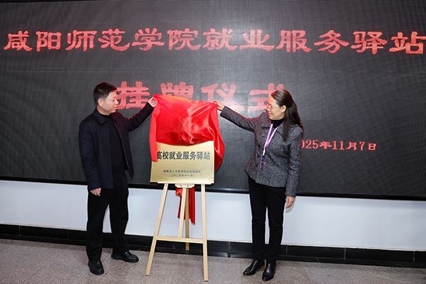 冯朝阳与周群英共同为“咸阳师范学院就业服务驿站”共同揭牌,标志着校地合作促就业迈入新阶段。