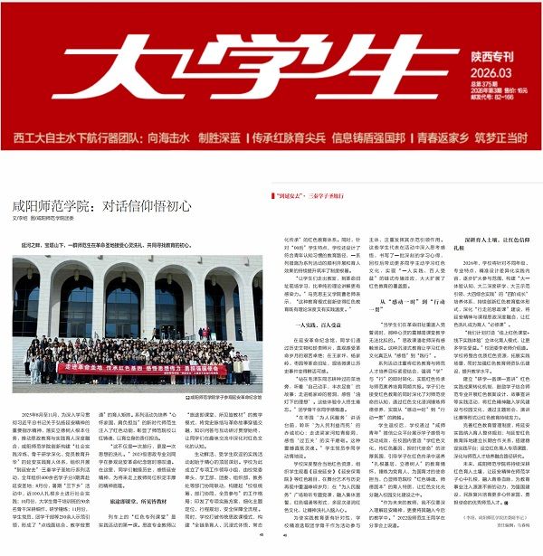近日,由中共北京市委宣传部主管、中共北京市委前线杂志社主办的《大学生》杂志2026年第3期,刊发我校文章《咸阳师范学院:对话信仰悟初心》,专题报道我校“到延安去・三秦学子圣地行”社会实践育人成果。