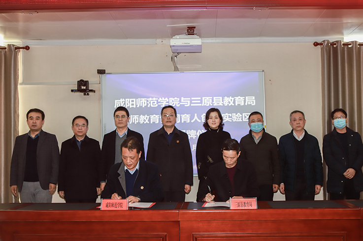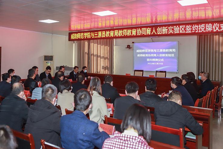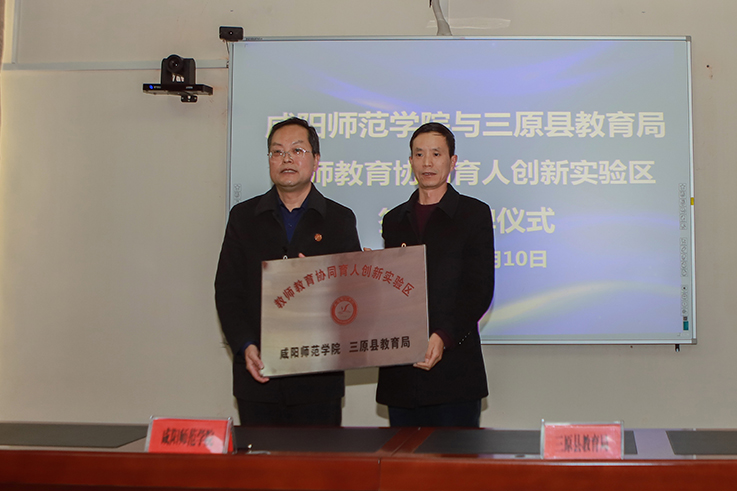 仪式上,舒世昌为“咸阳师范学院——三原县教师教育协同育人创新实验区”授牌。王长顺与李东战代表校地双方签署战略合作协议。