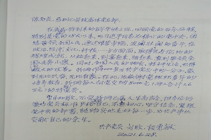 6月30日,在党的100周年华诞来临之际,我校离休干部刘耿、段惠敏夫妇每人向党组织上交8000元特殊党费。