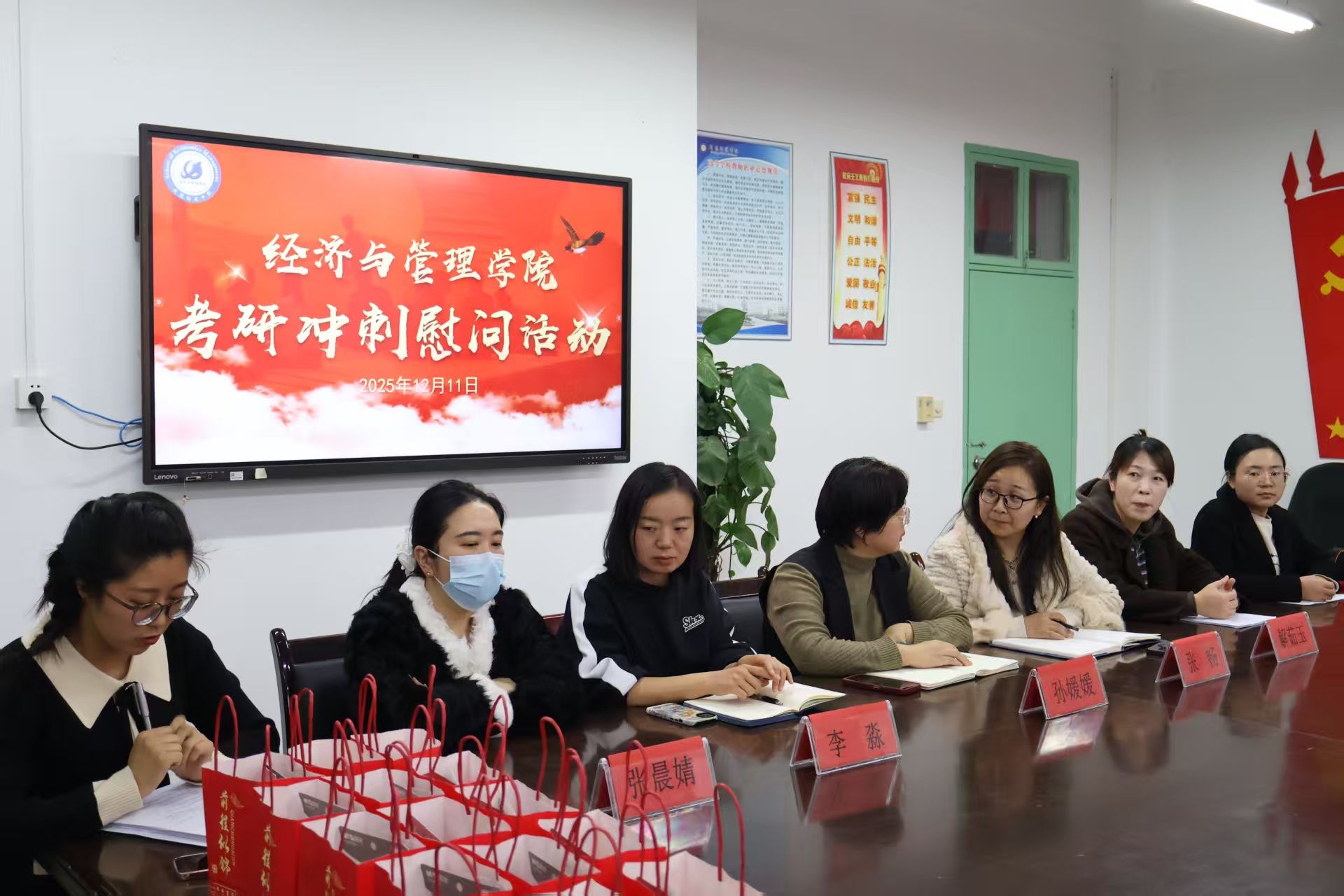 为激励考研学子坚定信心、科学备考,我院于12月11日在考研最后冲刺阶段组织开展专项慰问活动。学院副院长孙媛媛、各系系主任以及毕业班辅导员张丽芳参与活动,与备考学生进行交流,并送上鼓励与祝福。