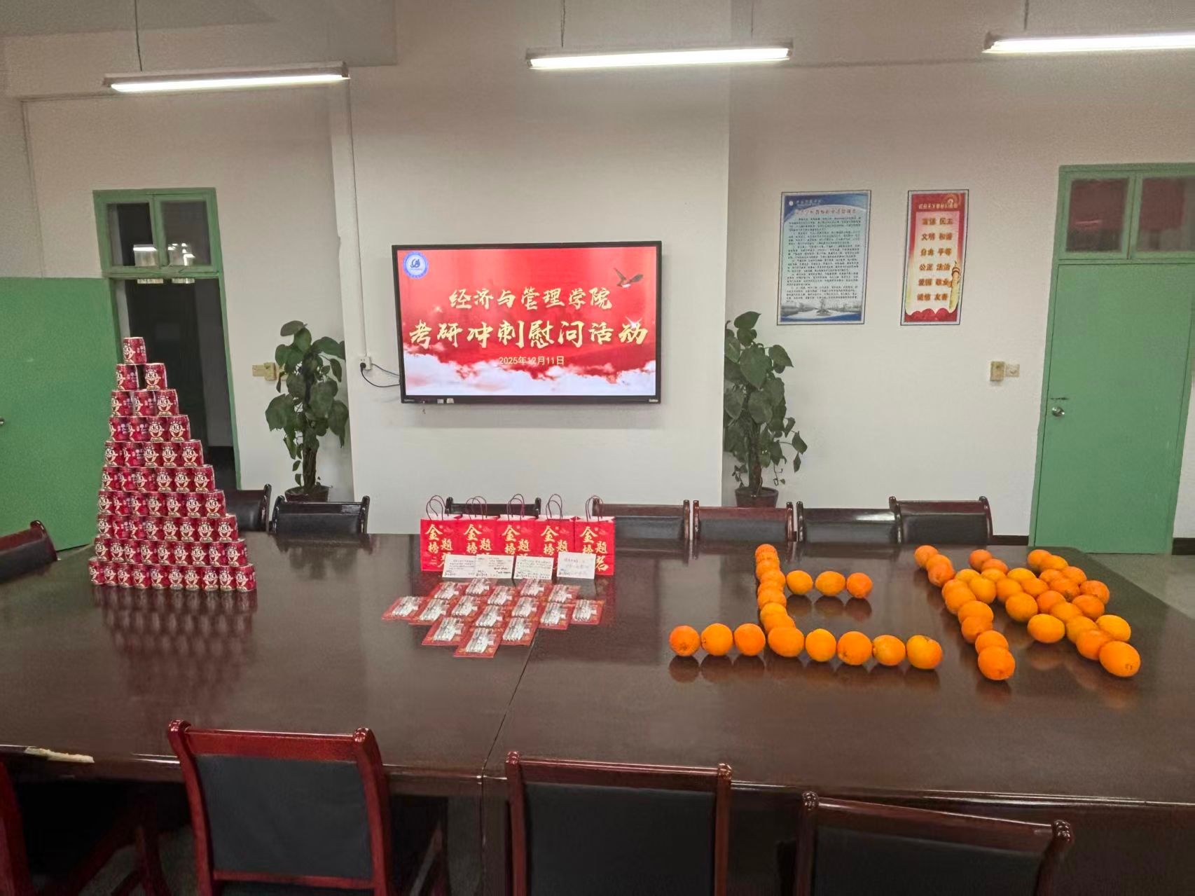 各系主任结合学科专业特点,为同学们提供了具有针对性的复习指导与备考建议。学院为每位考研学生精心准备了寓意美好的“考研加油包”,内含象征“心想事成”的橙子、寓意“精力充沛”的旺仔牛奶、寄望“下笔有神”的文具套装,以及满载师生祝福的励志贺卡。