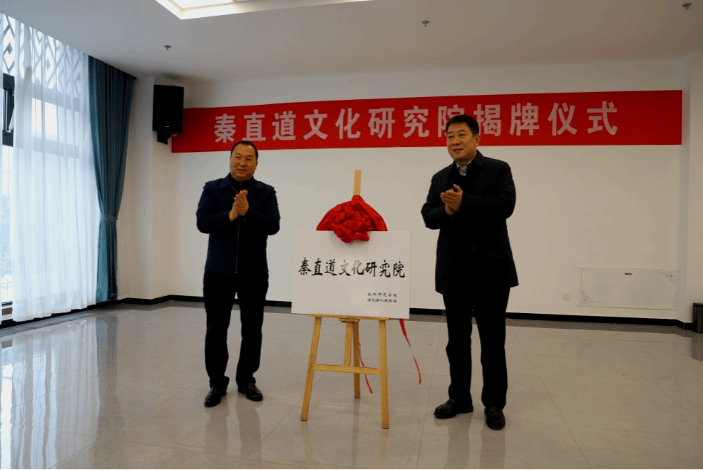 随后,淳化县委副书记、县长李建清与咸阳师范学院党委副书记、校长李佼瑞共同走到覆盖着红色绸布的牌匾前,携手为“秦直道文化研究院”揭牌。当红绸滑落,银白院牌显现时,全场响起热烈掌声,标志着这一专门研究机构正式成立运作。